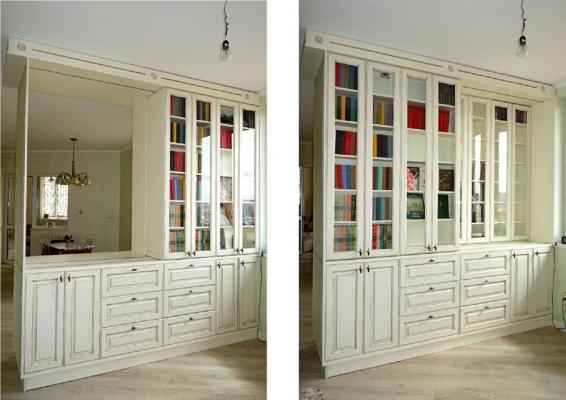 Кроме того, наполнение раздвижной библиотеки можно комбинировать. Например сделать передние секции книжными полками, а задние- местом хранения одежды, или в центральной части, в задних секциях организовать ТВ- зону. Здесь фантазия может рождать бесконечное количество вариантов. И выходит, что раздвижная библиотека может использоваться в любой комнате, кроме, пожалуй, ванной. Там книги хранить не стоит...