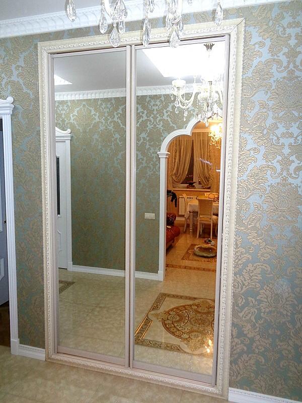 Встроенный в нишу двухдверный шкаф распашной с зеркальными фасадами и белой багетной рамой по периметру. Багет украшен лепниной. Фасады в алюминиевом профиле. Шкаф предназначен для хозяйственных нужд.