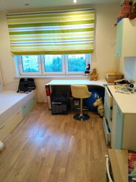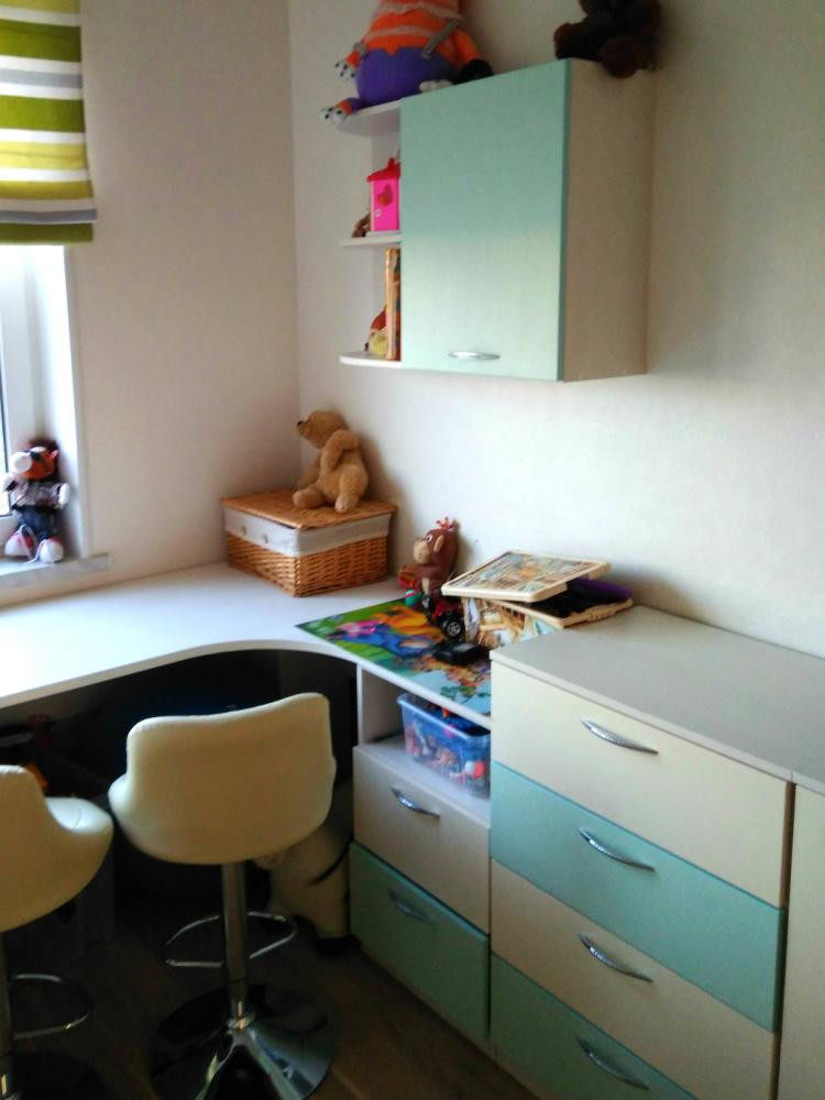 Все необходимое для отдыха и учебы в детской с мягкой комбинацией цветов фасадов и корпусов. Детская кровать с двумя выдвижными ящиками, большой угловой стол с тумбой и подвесной полкой, два комода и встроенный шкаф- купе.
