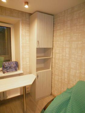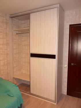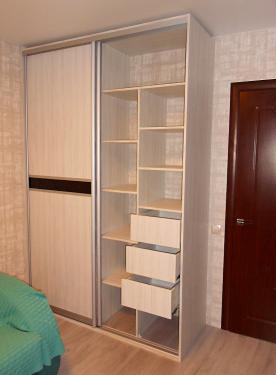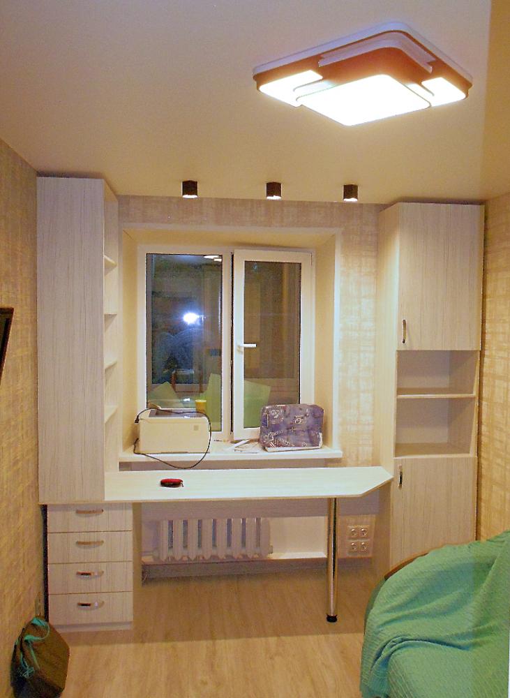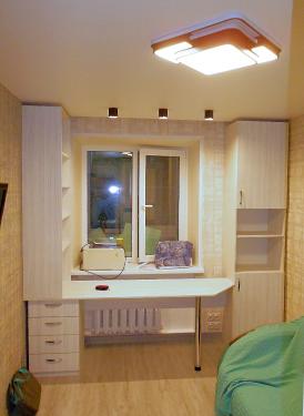 Шкаф- купе с рабочей зоной в спокойных светлых тонах в комнату юноши. Шкаф- купе встроенный. В фасадах вставка из черного стекла. Рабочая зона состоит из стола с тумбой с выдвижными ящиками, полкой и узким распашным шкафом.