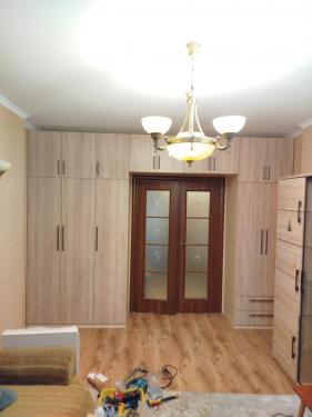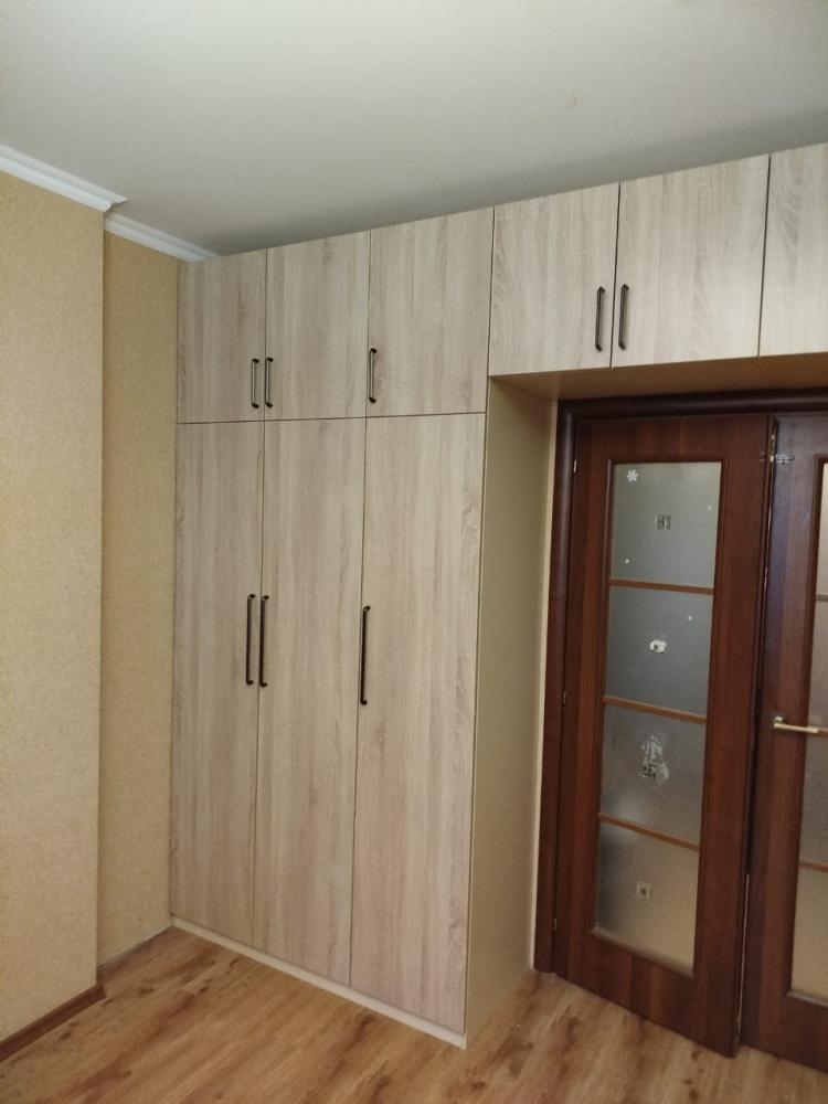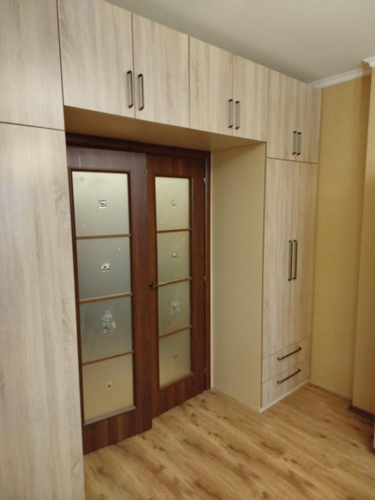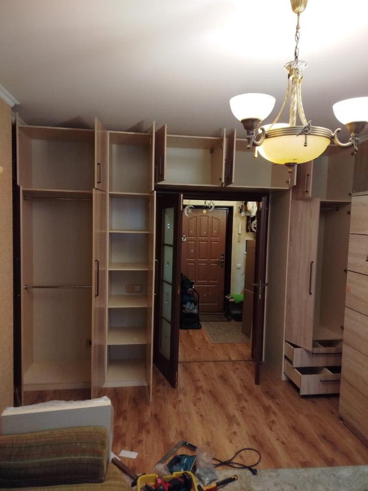 Набор мебели в детскую комнату. Два вместительных распашных шкафа с полками, выдвижными ящиками и штангами для одежды, антресольная полка над дверью в комнату создают мебельный портал вокруг входа в комнату.
