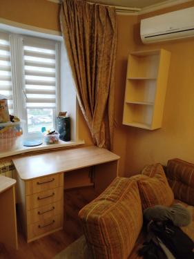 В зоне эркера рабочий стол с тумбой и выдвижными канцелярскими ящиками и подвесная полка на стене рядом со столом.