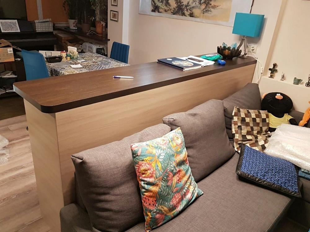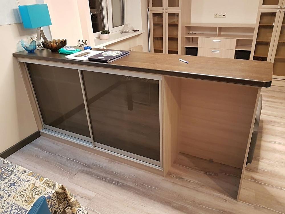 Компактная барная стойка, зонирующая комнату на гостиную зону и столовую. Фасады- купе с матовым стеклом БРОНЗА. Есть открытая ниша для барного стула.