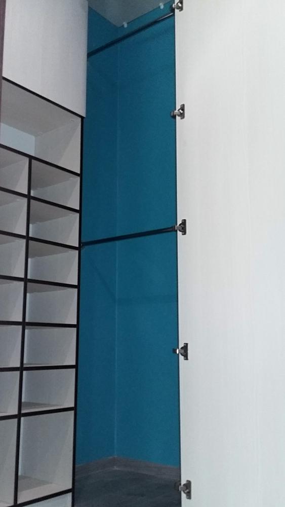 Встроенная гардеробная с двумя распашными фасадами по центру и глухими щитами лдсп по бокам. Слева и справа в гардеробной установлены штанги для одежды. В центре гардеробной установлен шкаф с множеством полок и закрытыми антресольными полками.