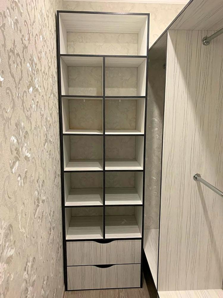 Встроенные гардеробные модули в отдельную комнату вытянутой формы. По длинной стороне расположен встроенный модуль со штангами в два ряда и нижними полками. Большая антресольная полка. По узкой стене поставили полу встроенный модуль с полками и выдвижными ящиками. У модуля есть боковины и крыша, но нет днища и задней стенки. Модуль прикреплен к стене.