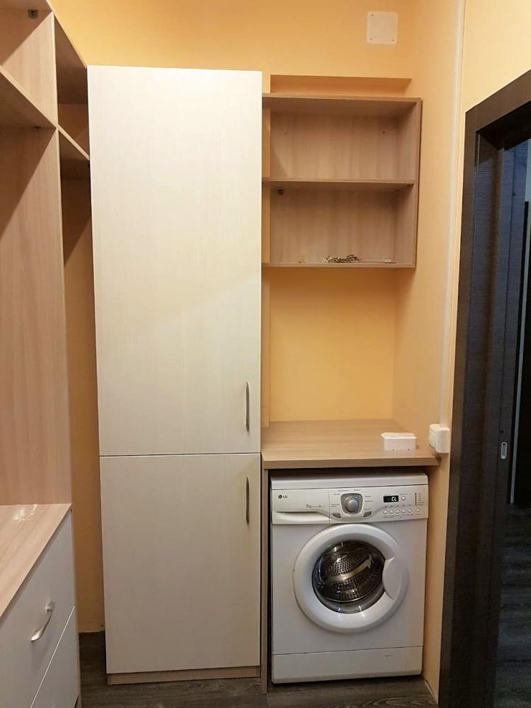 Вместительная и комфортная гардеробная комната. Встроенные, во всю длину комнаты стеллажи с полками, выдвижными ящиками и штангами для одежды. Отдельно стоящий "женский" шкаф с выдвижными ящиками, полками и нишей с небольшим зеркалом, и узкий шкафчик для хоз. нужд и бытовой химии. Над стиральной машиной открытая полка, а сама машина накрыта столешницей для удобства хозяйки. Нашлось место и для большого зеркала в раме. Мы использовали все пространство по максимуму.