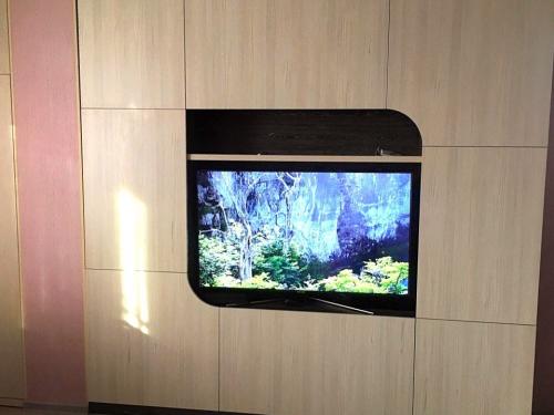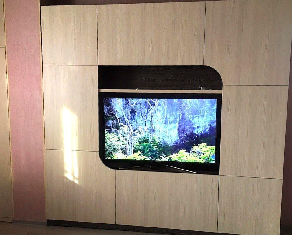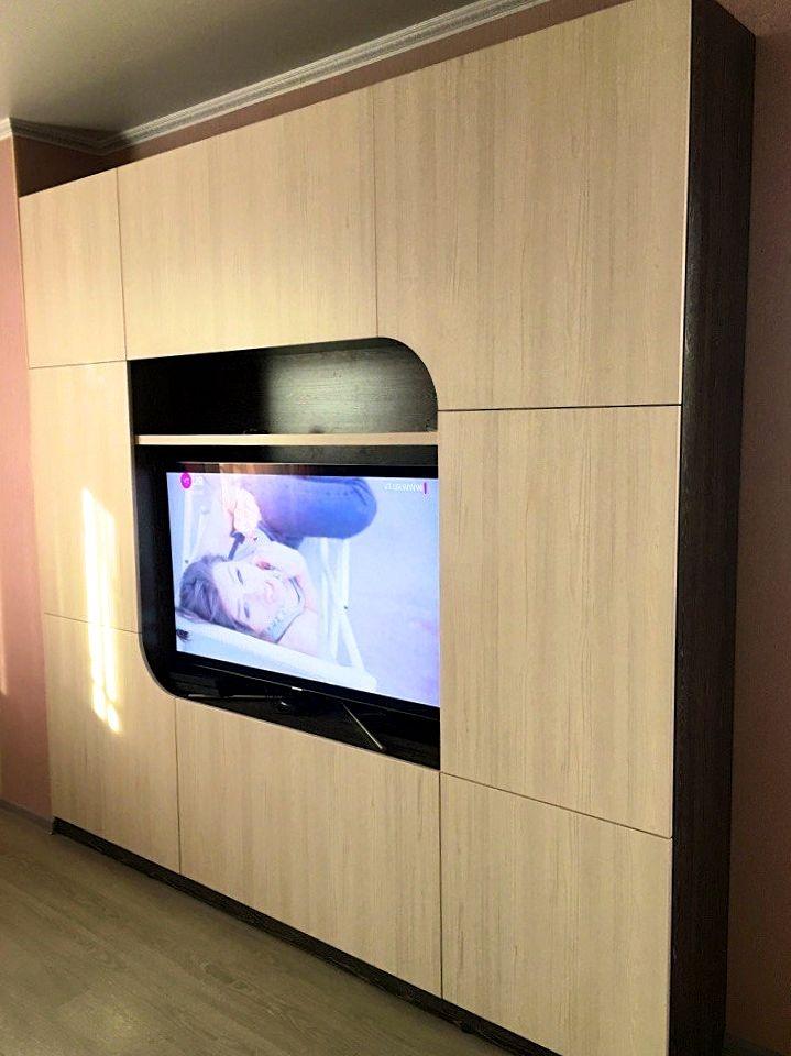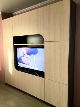 Лаконичная компактная, но достаточно вместительная стеночка для гостиной. Модули хранения за лаконичными "глухими" фасадами идут по периметру открытой ТВ- зоны, создавая вид рамы картины. Все фасады без ручек. Открываются нажатием.