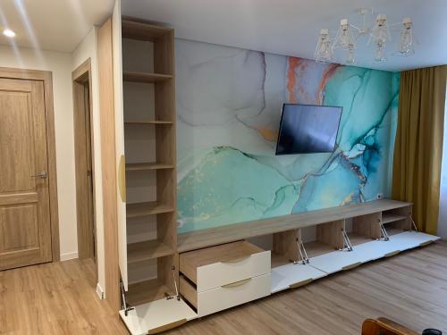 Лаконичный комплект мебели в гостиную, в зону ТВ. Длинная тумба с откидными вниз фасадами и блоком из двух выдвижных ящиков, и высокий узкий шкаф с полками. Мебель выдержана в современном лаконичном стиле.