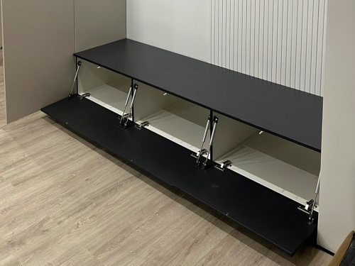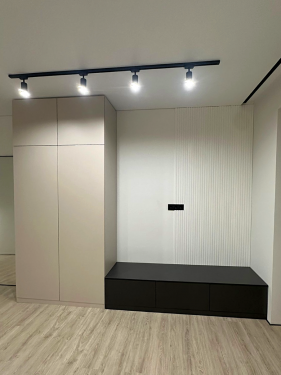 Распашной шкаф и тумба создают ТВ- зону в современном лаконичном стиле. Чистый функционал. Вместительный шкаф с полноценным комплектом хранения вещей. Это и штанга для одежды, и полки, и выдвижные ящики. Низкая тумба под телевизор с откидными вниз фасадами.