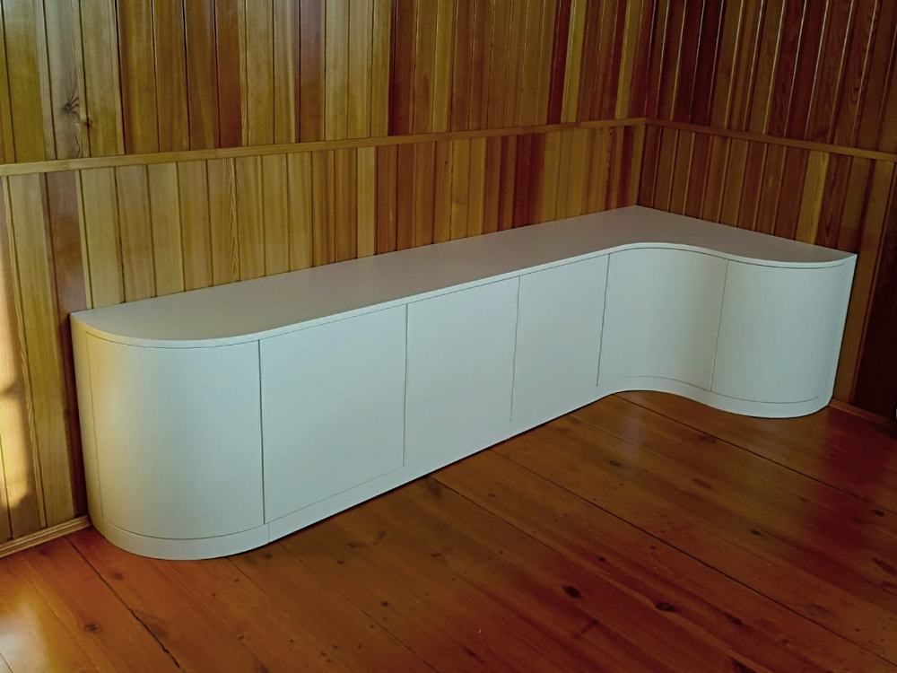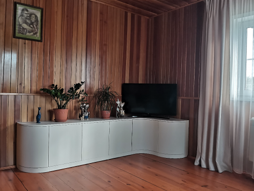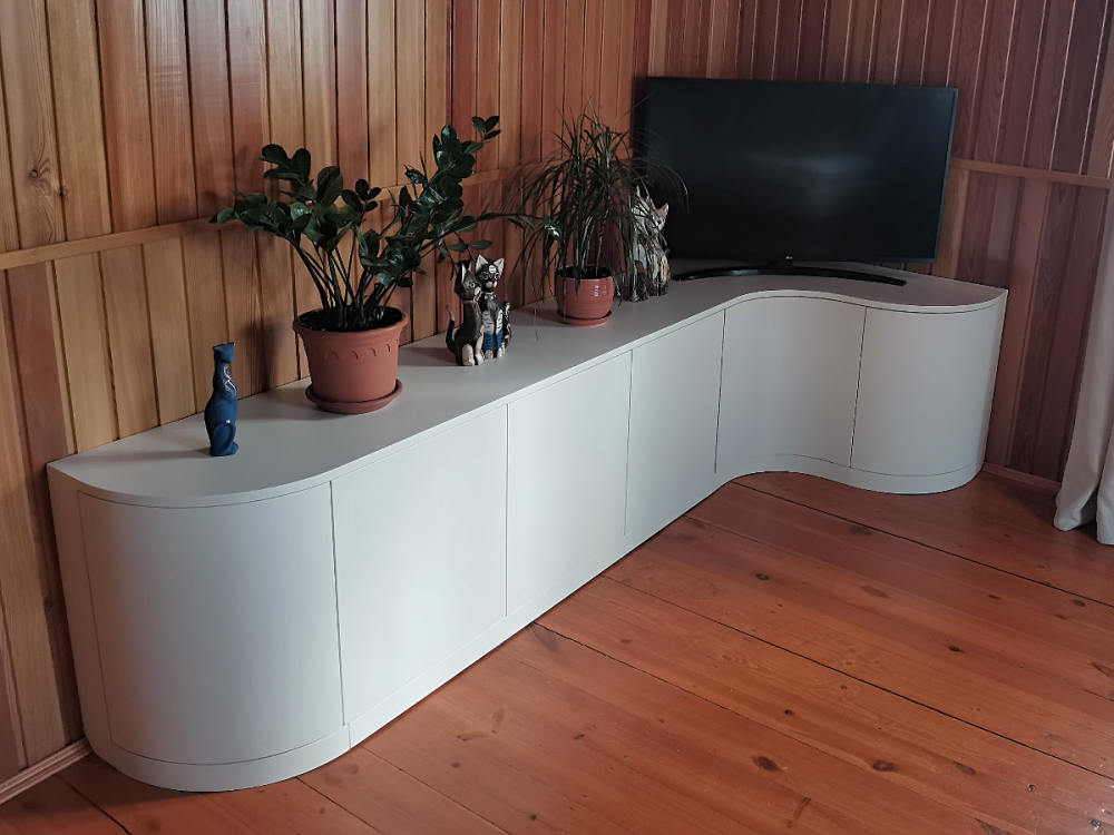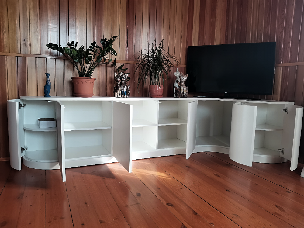Красивая угловая напольная тумба с прямыми и радиусными распашными фасадами. Корпус цельный. Открывание фасадов- нажатием. Фасады и все видимые элементы в матовой эмали.