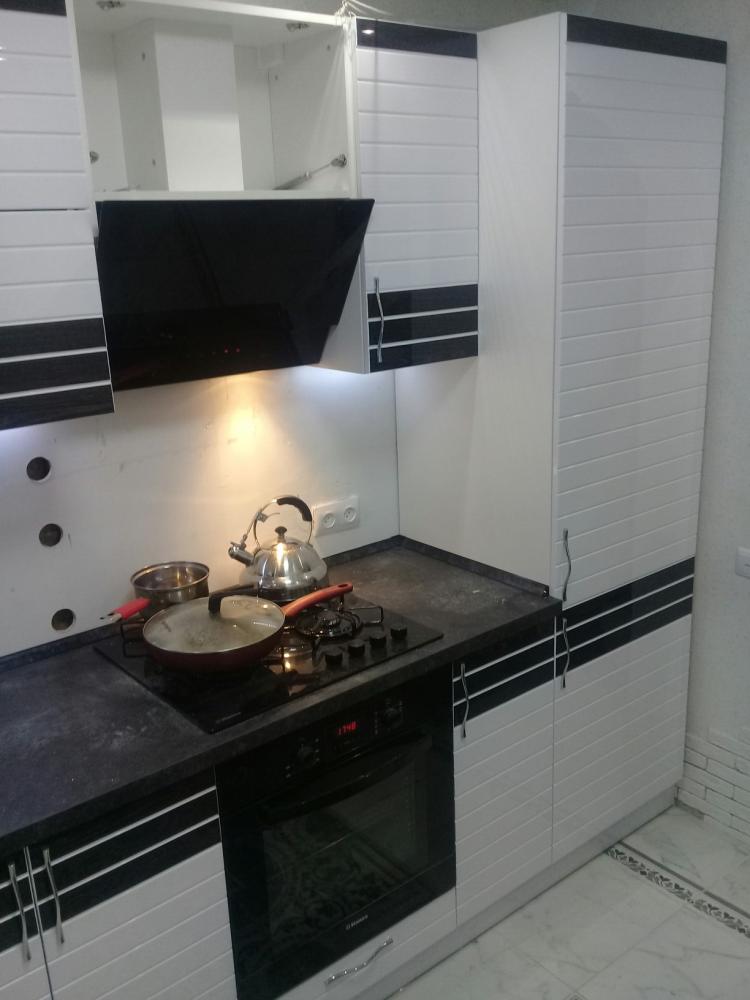 Большая угловая кухня с комбинированными фасадами. На фасадах нанесена горизонтальная фрезеровка. Сами фасады покрыты глянцевой эмалью. Сверху каждого фасада наклеены полосы глянцевой пленки пвх. Кухня большая и вместительная. Нижняя линия заходит под окно.
