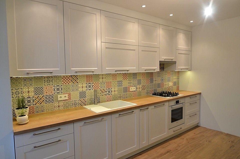 Красивая белоснежная прямая кухня в классическом стиле. Встроенная посудомоечная машина. Врезная светодиодная подсветка рабочей зоны. Верхние шкафы увеличенной высоты.