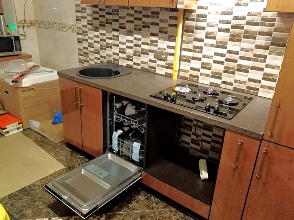 Красивая и компактная прямая кухня со встроенным холодильником. Фасады из мдф в глянцевом пластике. пластик является одним из самых надежных и долговечных материалов для покрытия фасадов. Столешница из искусственного камня. По желанию клиента пристеночный бортик не устанавливался. Встроенная посудомоечная машина.