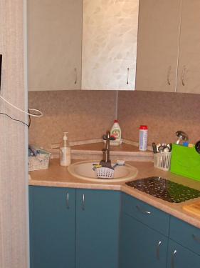 Просторная угловая кухня с пеналом для духового шкафа и свч печи.Верхние фасады- пленка пвх. Нижние фасады в пленке пвх Супер мат. Эта пленка легко моется от загрязнений. Вытяжка встроенная замкнутого цикла. Мойка из искусственного камня.