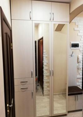 Вместительный распашной шкаф с зеркалами, обувной тумбой и открытой вешалкой. Полный комплект для хранения вещей в прихожую. За зеркальными фасадами шкафа большое отделение со штангой для одежды, В соседней секции выдвижные ящики и полки. Антресоли позволяют использовать всю высоту потолков.