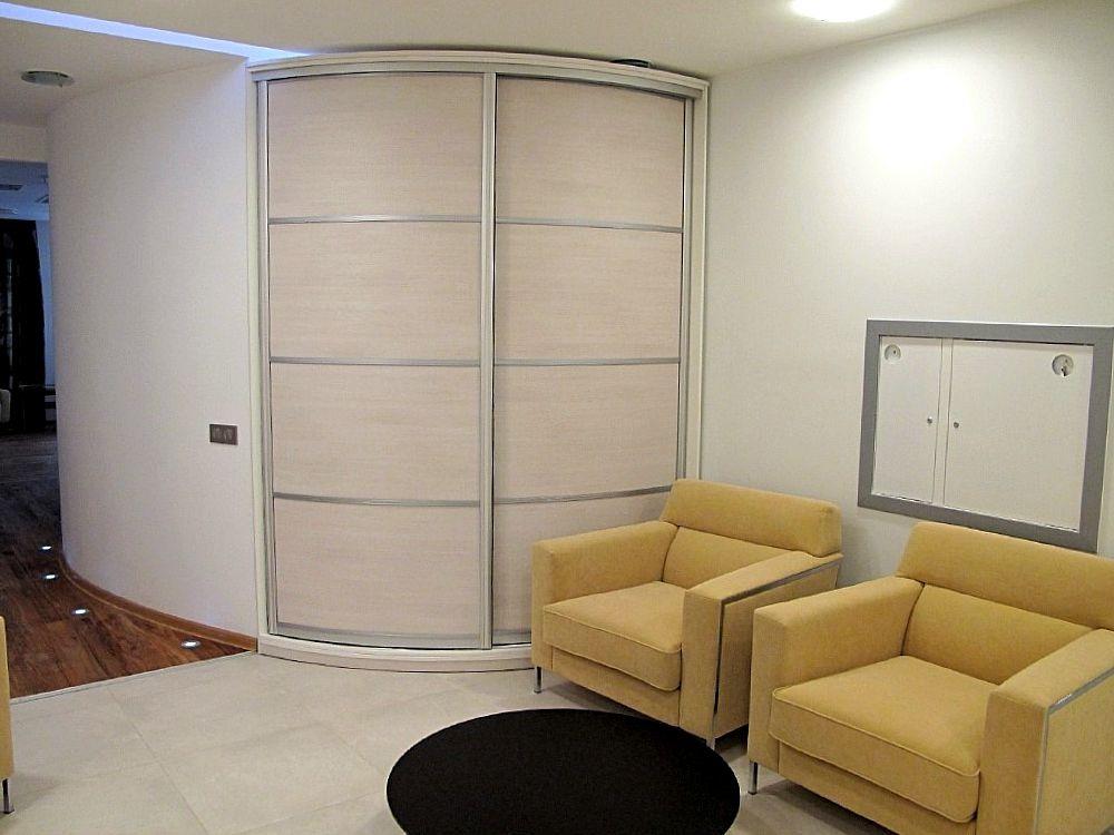 Угловой радиусный шкаф- купе с двумя фасадами в холл офиса. В фасадах пленка ПВХ на гибкой МДФ основе.