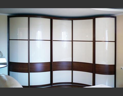Блестящий красавец- купе с радиусными фасадами волной в спальню. Шкаф вместил множество полок, штанги для одежды. Есть так же выдвижные ящики и радиусные полочки за крайними фасадами. Крайний правый фасад распашной.