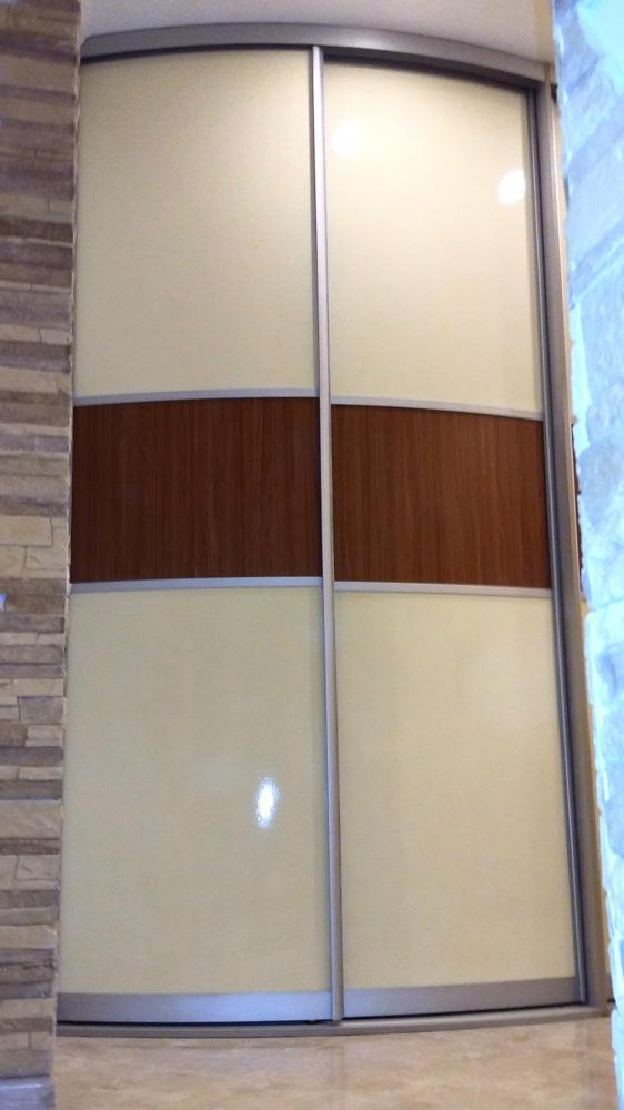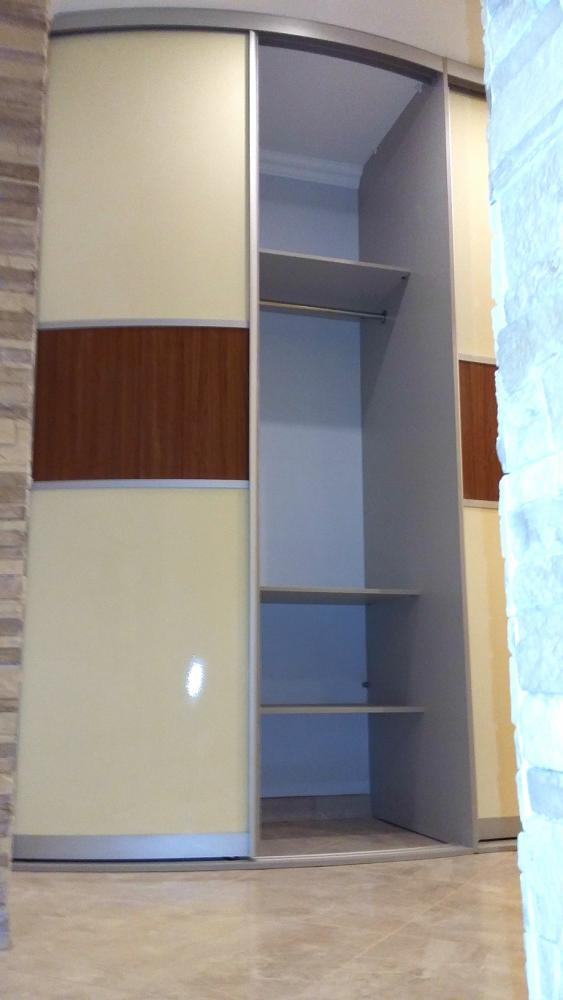 Шикарный встроенный радиусный шкаф- купе для большой прихожей коттеджа. Плавный переход выгнутых фасадов в вогнутые создает неповторимое ощущение роскошности. Функционально шкаф делится на, собственно шкаф с полками и штангами для одежды (два выгнутых фасада слева) и хоз. блок (три вогнутых фасада справа). Фасады хоз. блока закрывают от глаз технический участок прихожей с водонагревателем и коммуникациями. Минус и "головную боль" интерьера мы преобразовали в плюс.