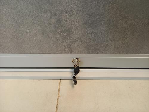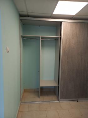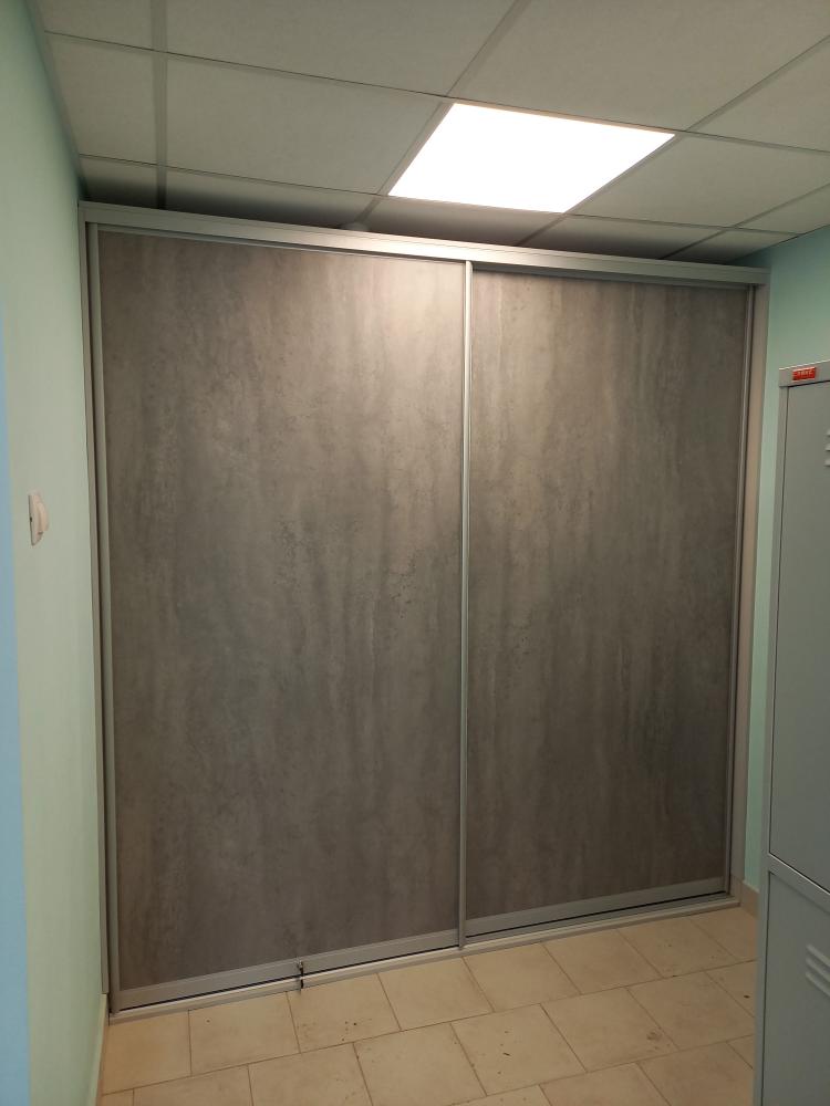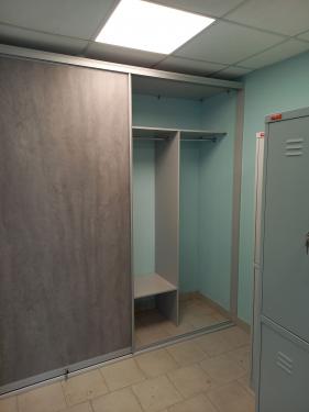 Встроенный двухдверный шкаф- купе в гардеробную частной клиники. Двери шкафа оборудованы замком. Шкаф предназначен для верхней одежды и головных уборов клиентов.