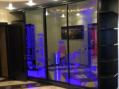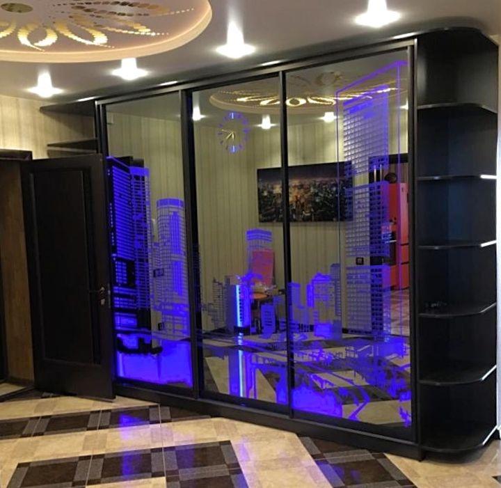 Красивый трехдверный темный шкаф- купе в прихожую с подсветкой пескоструйного рисунка фасадов. В центральном фасаде сверху установлены часы. Циферблат так же пескоструй с подсветкой. Внутреннее наполнение шкафа позволит хозяевам комфортно хранить свои вещи и размещать вещи достаточного количества гостей. Для повседневной одежды предусмотрена открытая вешалка.