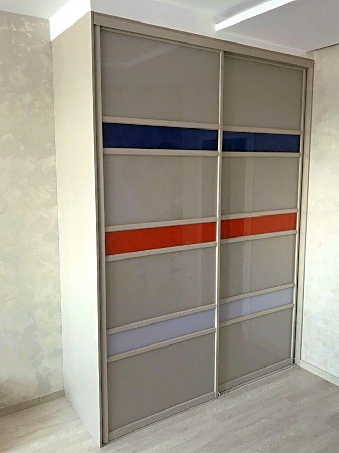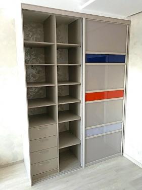 Полу встроенный шкаф- купе двухдверный с крашеными с задней стороны стеклами. По желанию клиента на фасады выдвижных ящиков установлены накладные ручки.