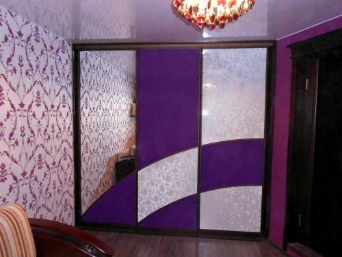 Красивый оригинальный встроенный шкаф-купе в комнату девушки. Фасады с радиусными делителями делают шкаф оригинальным и не повторимым. Потолок натяжной с закладным брусом.
