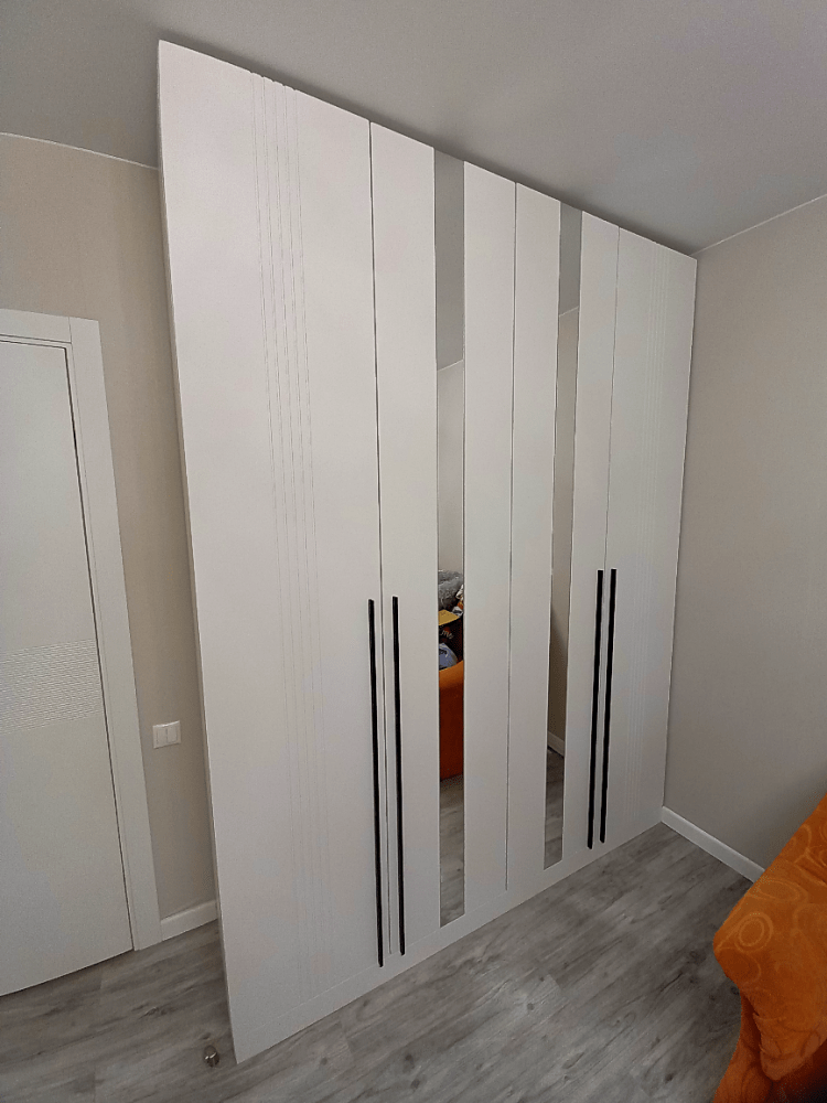Красивый светлый шкаф для гостиной с распашными фасадами в эмали матовой. На боковых фасадах современная фрезеровка в виде параллельных полос. На средних фасадах узкие полосы зеркал.