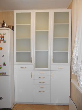 Белоснежный буфет для кухни с распашными фасадами и выдвижными ящиками. Буфет не только красив, но и удобен для хранения кухонной утвари.