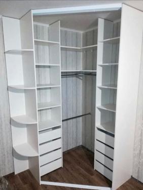 Вместительный угловой встроенный шкаф- купе в спальню. Функциональный белый красавец. В наполнении шкафа есть все необходимое. Штанги для одежды, полки, выдвижные ящики, открытые радиусные полки.