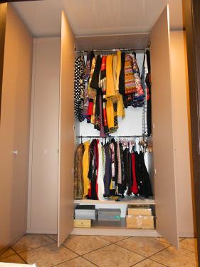 Большой и очень вместительный набор угловых распашных шкафов с тумбой и настенным зеркалом. Наполнение шкафов укомплектовано всем необходимым для организации удобного хранения одежды, белья и хозяйственных принадлежностей. В комплект входят небольшая обувная тумба и настенное зеркало.